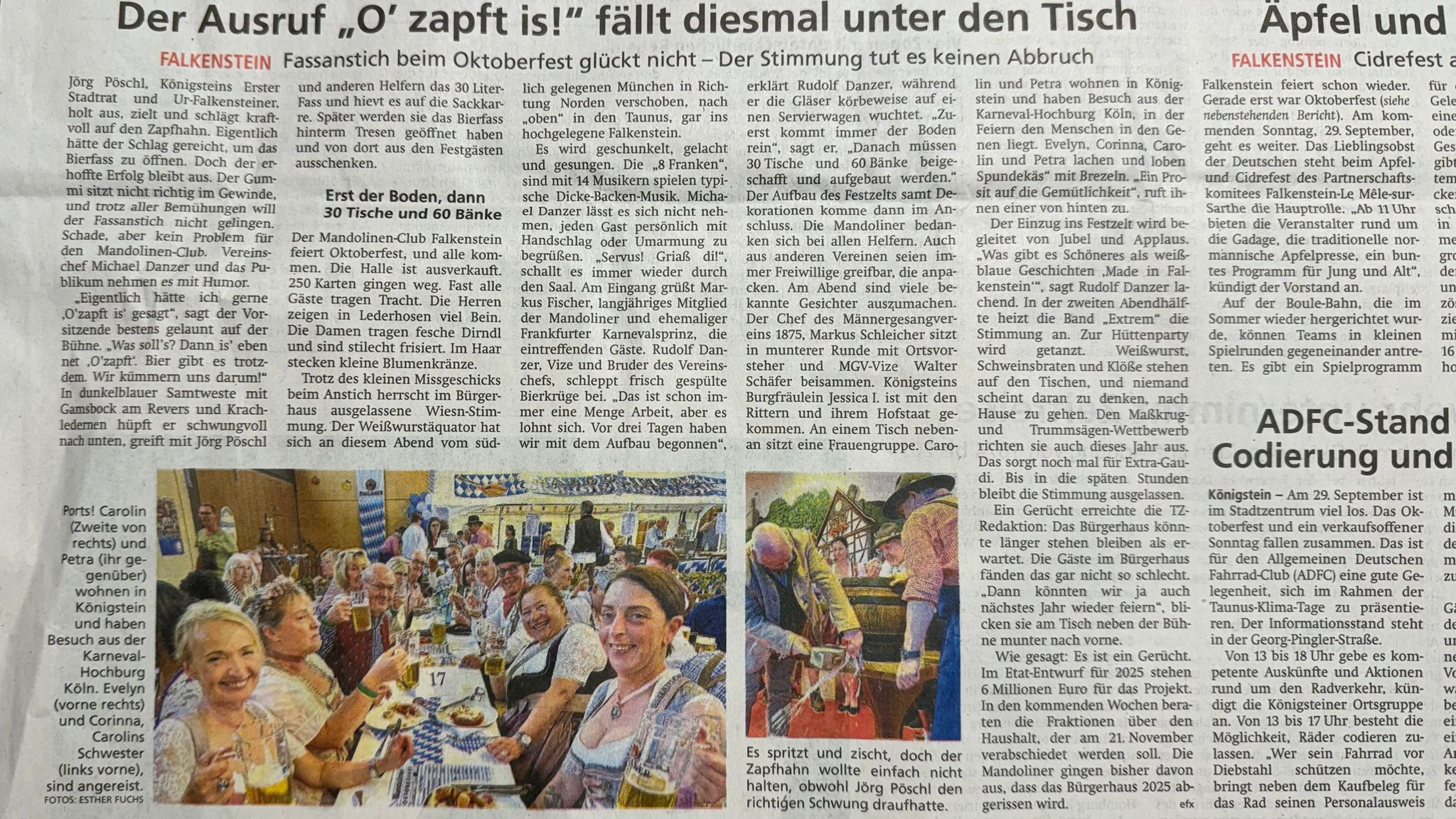 Am 2. Januar trafen sich der 1. Vorsitzende Michael Danzer und Schriftführer Jürgen Schnöbel mit der Redakteurin der Taunus Zeitung zu einem längeren Gespräch betreffend des anstehenden Vereinsjubiläums. Hier der zugehörige Bericht in der Taunus Zeitung vom 8. Januar 2025.